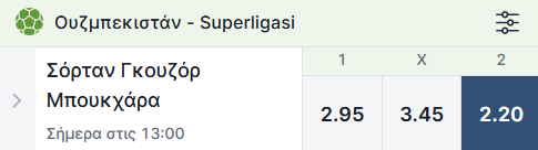 Στο Ουζμπεκιστάν η Σόρταν Γκουζόρ εξακολουθεί να είναι τελευταία με 19 ήττες και τρεις μόνο νίκες σε 28 αγωνιστικές. Έχει δεχθεί τα περισσότερα (53) τέρματα και έχει τη χειρότερη έδρα στην κατηγορία. Η Μπουξόρο διατηρεί πολύ καλή πρόσφατη παράδοση εκεί μέσα αφού έχει υποστεί μόνο μία ήττα στις 10 πιο πρόσφατες επισκέψεις της. Παρουσιάζεται βελτιωμένη αγωνιστικά και η απόδοση του διπλού υποχωρεί.