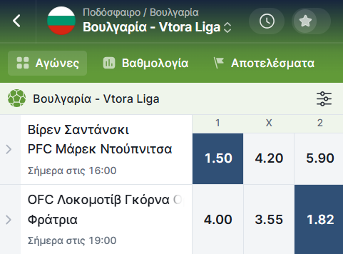 Καλημέρα και καλή εβδομάδα. Στο πρωτάθλημα της Β Βουλγαρίας η Φράτρια (φωτο) που διεκδικεί άνοδο, βρίσκεται σε φουλ φόρμα καθώς μετρά 8 νίκες σε εννιά παιχνίδια. Εκτός έδρας μάλιστα έχει τέσσερα στα τέσσερα!