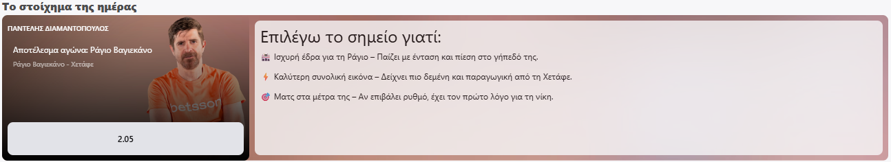 Ψάχνεις ακόμα το καλύτερο σημείο της ημέρας; Τώρα η Betsson κάνει τα πράγματα πιο απλά. Κάθε μέρα, ο Παντελής Διαμαντόπουλος διαλέγει για σένα το «Στοίχημα της ημέρας» για να έχεις πάντα μια ιδέα… από έμπειρο χέρι.
